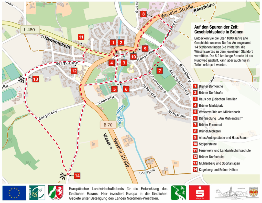 Der Brüner Marktplatz ist Ausgangspunkt für einen ca. 5 km langen Weg durch Brünen, wo an 14 Stationen auf Infotafeln etwas zur Geschichte von Brünen erklärt wird.