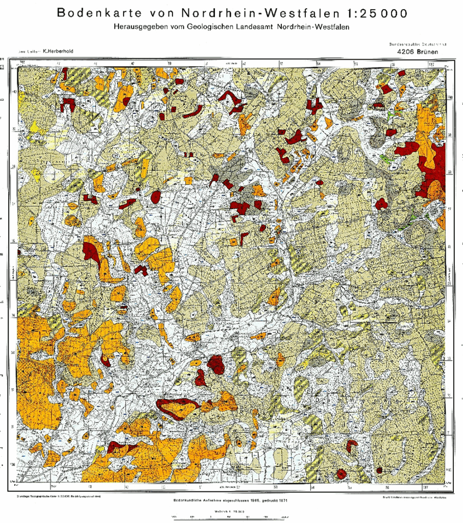 Die orange eingefärbten Regionen sind durch Plaggenwirtschaft entstanden. Brünen liegt unten links auf der Karte und stellt ein größeres zusammenhängendes Gebiet mit Plaggenesch-Böden dar.