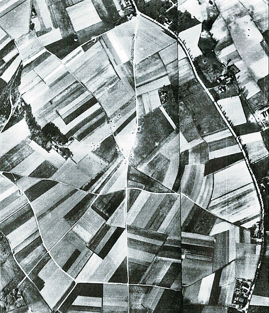 Der Kugelberg bei Brünen in einer britischen Luftaufnahme vom 24.03.1945. Die Flakstellung auf dem Berg ist gut zu erkennen. Eine Dreieckstellung zeigt, dass die schweren Geschütze von leichter Flak geschützt wurden. Am bewaldeten Westhang sind Schützengräben angelegt worden. (Fotoausschnitt von Seite 457 aus „Die Luftlandung“ von Johann J. Nitrowski)